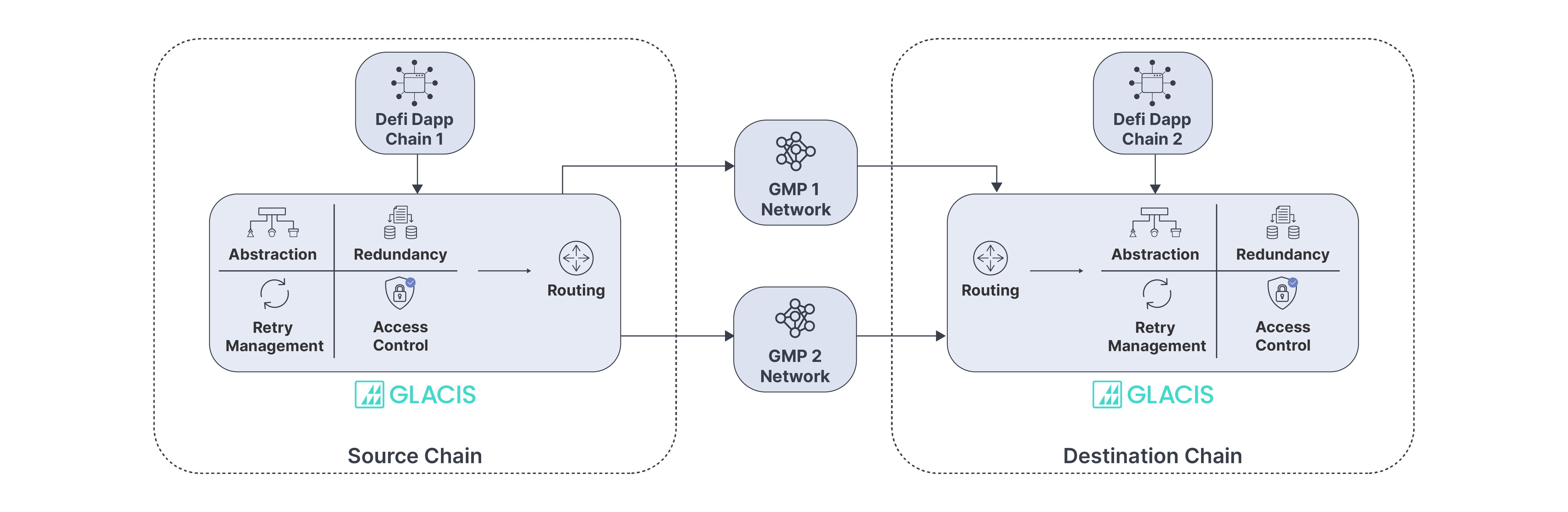 The first thing that Glacis does to help address cross-chain challenges is to mitigate the risks with having a single bridge for your protocol or application. Glacis creates an abstraction layer on top of supported bridges and general message passing providers. This means that developers just integrate once with Glacis, but that gives them a multi-bridge implementation. Glacis dramatically simplifies multi-bridge implementations, putting them in reach for every Web3 team.
