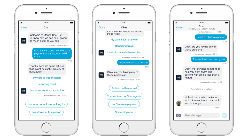 Below an example of the “Chat widget” of Monzo, known in the UK for being consistently one of the first bank in customer satisfaction.