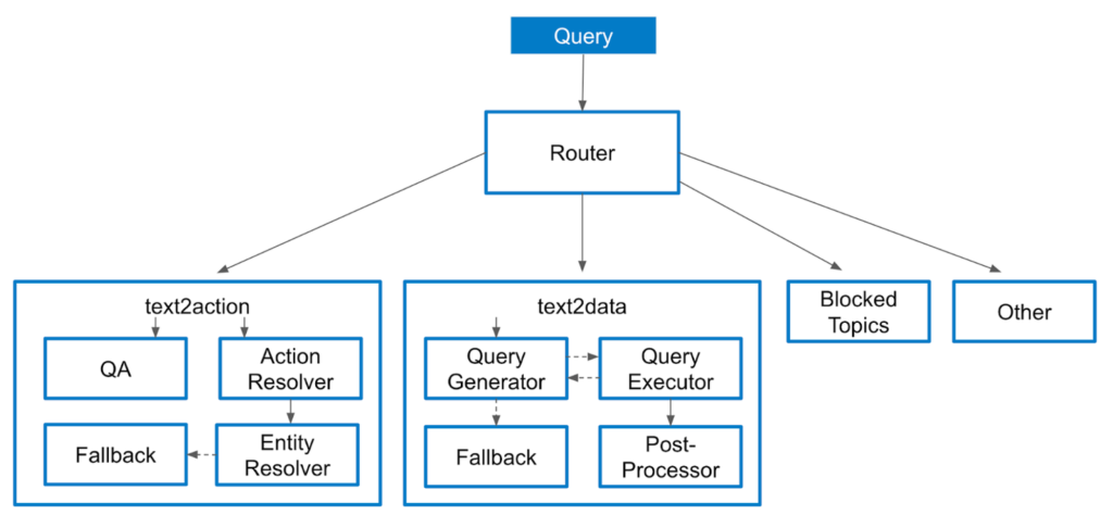 A typically 2024 customer agent design appear more as a pipeline, where incoming user queries are routed to specific pre-defined agentic workflows: often one set handles direct actions (“text2action”) and another handles data retrieval (“text2data”).